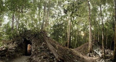 Pohon-pohon tumbuh di atas gundukan yang sebenarnya rumah dibangun oleh orang-orang Maya dan berisi gambar-gambar figur kuno, kemungkinan juru catat kota, dalam foto yang diperoleh Reuters 10 Mei 2012. Rumah ini ditemukan di pinggir situs kuno Xultun di Guatemala, kota yang dulunya menampung puluhan ribu orang.